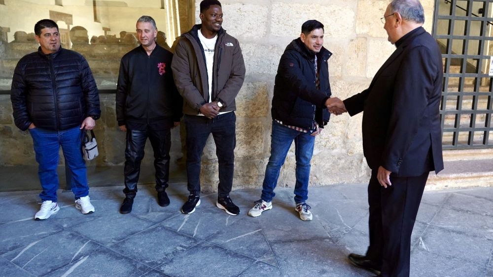 El obispo de León, Luis Ángel de las Heras, recibió este martes a los internos del Centro Penitenciario de Mansilla de las Mulas 'Villahierro' y del CIS 'Jesús Haddad' que participarán esta tarde en la tradicional Procesión del Perdón, organizada por la cofradía del Santo Cristo del Perdón.