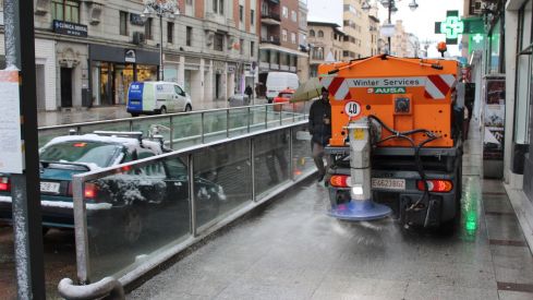 El Servicio de Limpieza cuenta con tres vehículos despejando la nieve de los accesos a centros de salud y zonas más transitadas de la ciudad. Mantienen operativas cuatro esparcidoras de sal, a las que se suma el esparcimiento manual de los barrenderos.