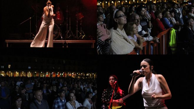 La Plaza Mayor, iluminada suavemente, acompañó con su solemnidad y belleza a la artista, convirtiendo la experiencia en casi un ritual colectivo de disfrute musical.