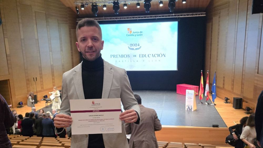 Lo bueno se hace esperar, o al menos eso debió pensar Carlos Gómez en la ceremonia de los Premios de Educación de 2024. Y es que después de no recibir el diploma que acreditaba su reconocimiento en 2021, ha sido este viernes, en el Centro Cultural Miguel Delibes, donde el leonés ha recogido uno de los 26 diplomas nacionales que acreditan la excelencia académica de cada familia profesional en España.