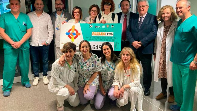 El Colegio Leonés entregó a la Asociación Leonesa Con Las Enfermedades de la Sangre (Alcles) un equipo de sonido y un total de 5.649 euros recaudados mediante la campaña solidaria ‘Por un día más’, con el objetivo de acondicionar una sala de respiro para los padres de pacientes críticos y de larga estancia hospitalizados en el Servicio de Pediatría del Complejo Asistencial Universitario de León y para otros programas de Alcles Infantil.