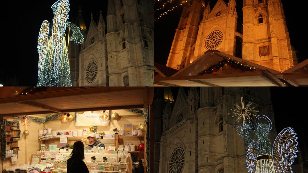 Los ángeles ubicados a los pies de la Catedral de León han vuelto a cantar y bailar por la Navidad. La música ha ambientado un año más la plaza de Regla, donde se ubica una vez más el mercado navideño con 40 casetas para hacer compras navideñas.