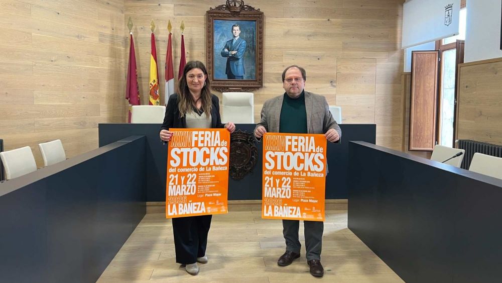 El salón de plenos del Ayuntamiento de La Bañeza acogió esta mañana la presentación oficial de la XXXIV Feria de Stocks del Comercio, que se celebrará los días 21 y 22 de marzo en la Plaza Mayor de la ciudad. El acto contó con la presencia del alcalde de La Bañeza, Javier Carrera de Blas, y de la concejal de Comercio, Elena Bailez, quienes destacaron la relevancia de esta feria como referente del comercio local y comarcal.