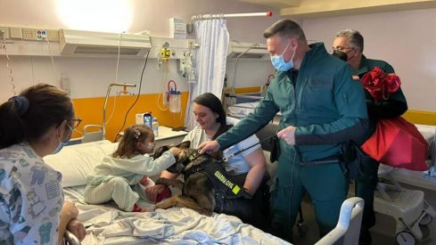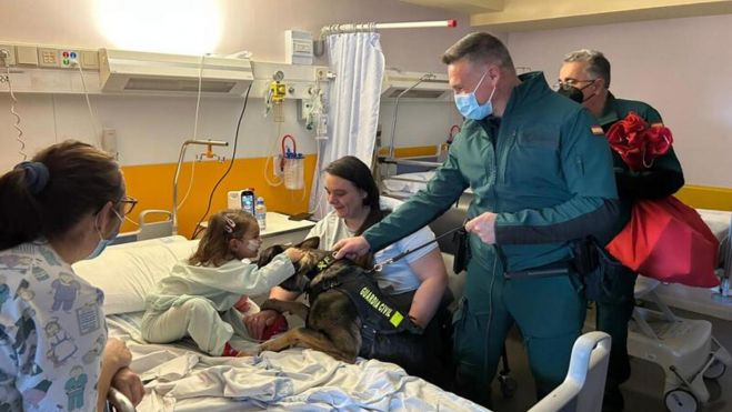 Los pequeños ingresados en la planta de Pediatría pudieron disfrutar y pasar un rato con los agentes de la Guardia Civil y dos guías caninos de la unidad del Secir, en un acto que contó con la presencia del presidente de la Asociación en León, Estanislao de Luis, el teniente coronel Juan Villa, parte del equipo directivo del CAULE, con las jefas de Enfermería y Dirección Médica y el jefe de la Unidad Pediátrica, Juan Pablo Martínez Badás.