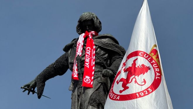 Desde la semana pasada, muchos balcones de la ciudad lucen sus banderas de la Cultural y desde este miércoles, la estatua de Guzmán el Bueno se ha sumado al apoyo al equipo. El lugar donde tendrá lugar una posible celebración del ascenso ya luce con orgullo una bufanda y una bandera del club.