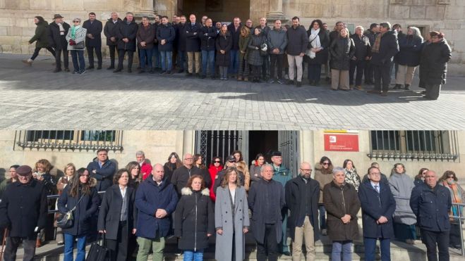 Un minuto de silencio guardado a las puertas de la Diputación de León en el que han participado las corporaciones de la institución provincial y del Ayuntamiento de León, encabezados por Gerardo Álvarez Courel y José Antonio Diez.