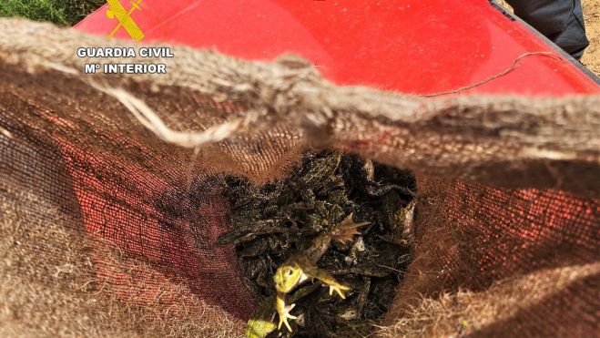 Identificada dicha persona, se verifica que el método empleado consiste en el arte de pesca tradicional para la pesca de ranas, consistente en caña, hilo y trapo de tela de color rojo, localizando en el interior del vehículo empleado por el pescador, una bolsa de tela y de un saco conteniendo en su interior más de 200 especímenes de rana común (pelophylax perezi), cuyo destino final era la venta en establecimientos hosteleros de la comarca con el fin de obtener un beneficio económico.