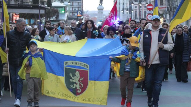 La Asociación de Amigos Leoneses Ucranianos Damnificados ha celebrado este martes una manifestación con motivo del cuarto aniversario del inicio de la invasión de Rusia a Ucrania. La manifestación, que salió desde la Glorieta de Guzmán, llamó a la ciudadanía a mostrar su apoyo al pueblo ucraniano y a recordar a las víctimas del conflicto.