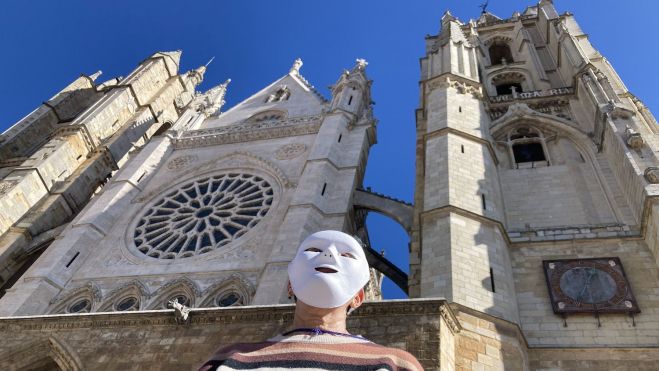 La plaza de la Catedral de León acogió este domingo la movilización organizada por la Revuelta de Mujeres en la Iglesia, que a través de una ‘performance’ reivindicativa reclamó igualdad y denunció lo que consideran una “inmovilidad del patriarcado clerical” que ha ahogado sus identidades y sus cuerpos para encerrarlas en dos modelos contrapuestos, el de virgen y santa o el de Eva y pecadora.