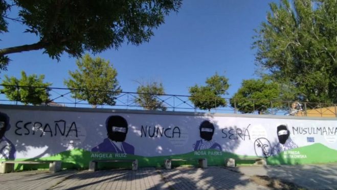 En esta ocasión, en el mural se puede leer la frase ‘España nunca será musulmana’ y las cabezas de sus protagonistas aparecen cubiertas con hiyab, el pañuelo que utilizan las mujeres que practican la religión islámica.