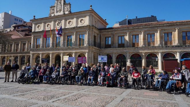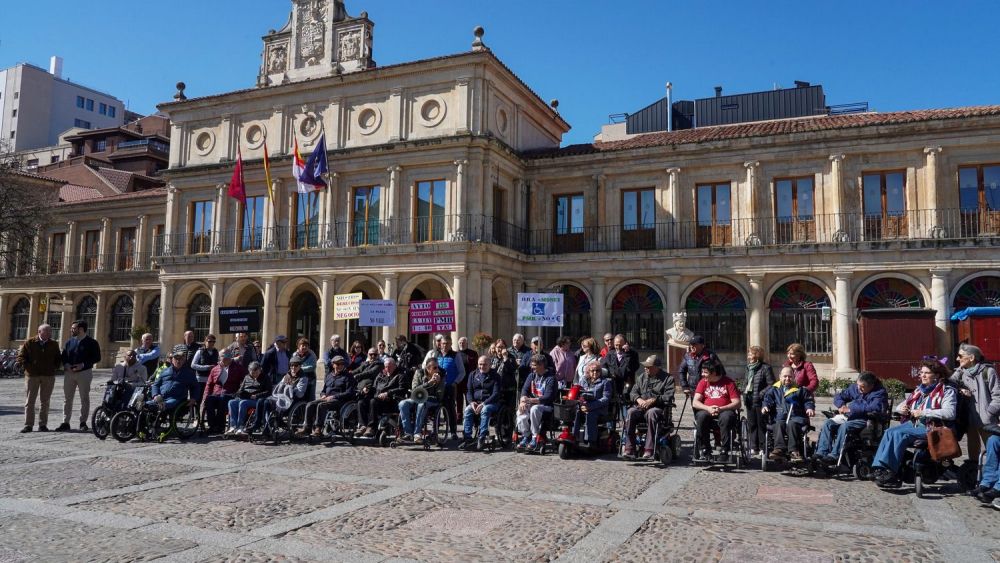 Un grupo de personas con movilidad reducida se concentró este miércoles en la plaza de San Marcelo de la capital leonesa, frente a la sede del Ayuntamiento, para reclamar la dotación de 125 plazas más de aparcamiento destinadas a este colectivo.