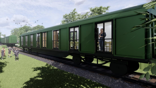 Cada vagón, de 56,40 m², con alturas interiores de 2,15 a 2,85 metros, y situados a 1,47 metros de altura sobre el terreno, apoyados en bases de hormigón y raíles, contará con diferentes funciones, siendo dos de los cinco destinados a vivienda.