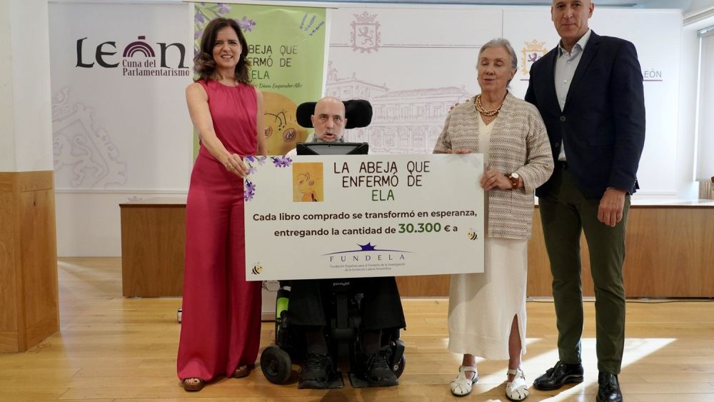 El ex jugador de baloncesto, Urbano González Escapa, y la docente Diana Emperador han presentado este sábado la recaudación que ha conseguido el libro 'La abeja que enfermó de ELA', que narra la historia, con ilustraciones y texto de Diana, de este leonés desde que fue diagnosticado con Esclerosis Lateral Amiotrófica.