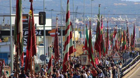 El tiempo acompañó la jornada con un sol radiante ideal para el desfile de pendones y carros engalanados. Las telas de los emblemas ondearon sin contratiempos mientras avanzaban lentamente hacia el santuario, guiadas por la música leonesa que daba ritmo a la caminata.