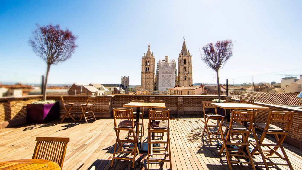 Situación similar la que se puede vivir en la 'Terraza del Hotel Camarote', con su entrada por la calle Dámaso Merino, esta terraza es un oasis urbano en el corazon de León. Sus vistas hacia la Pulchra Leonina son también privilegiadas, ya que pocas veces podrás disfrutar del Rosetón desde su misma altura.