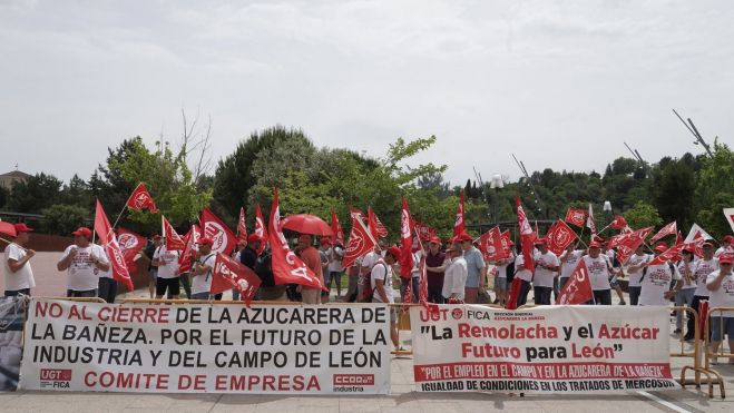 Más de un centenar de trabajadores de todos los centros de Azucarera de la Comunidad reivindicaron este martes ante las Cortes de Castilla y León el “rechazo absoluto” del cierre de la planta de La Bañeza (León), así como el planteamiento de despidos en otras instalaciones del grupo.