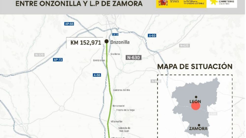 El Ministerio de Transportes y Movilidad Sostenible ha licitado por 7,9 millones de euros (IVA incluido) las obras para la rehabilitación estructural del firme en diversos puntos de la carretera N-630 entre los km 153 y 204, tramo comprendido entre la localidad de Onzonilla y el límte provincial con Zamora, en la provincia de León. El anuncio correspondiente será publicado próximamente en el Boletín Oficial del Estado (BOE).