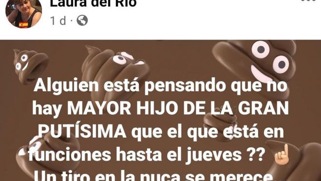 También, acompaña el mensaje colocado por Laura de Río en su cuenta de facebook en el que afirma que no la importa que puedan bloquear su perfil. “Alguien está pensando que no hay mayor hijo de la gran putísima que el que está en funciones hasta el jueves”. “Un tiro en la nuca se merece… ya lo he dicho”, es el texto escrito y objeto de a denuncia por parte del PSOE.